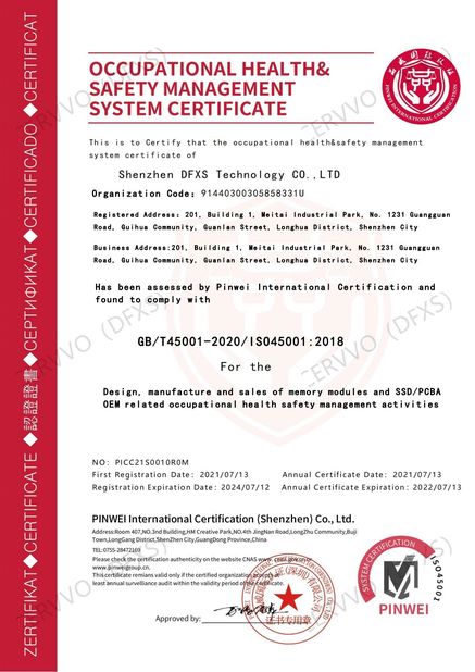 | Scope / Range: | Design, manufacture and sales of memory modules and ssd/pcba oem related occupational health safety management activities |